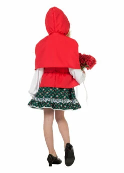 Gebloemd jurkje met rood vestje en cape met capuchon.